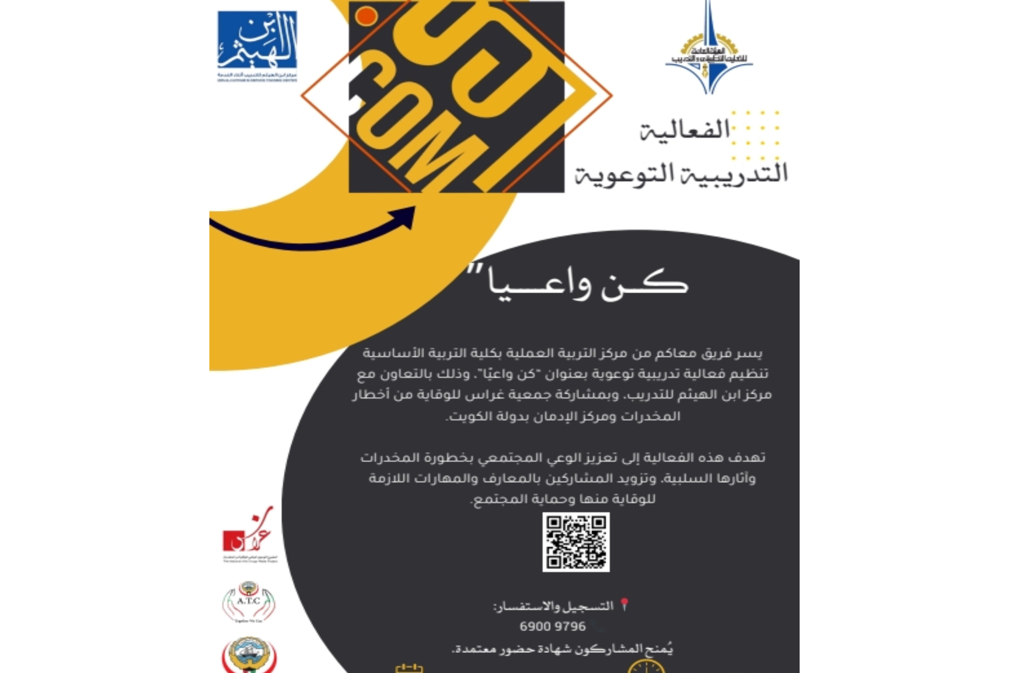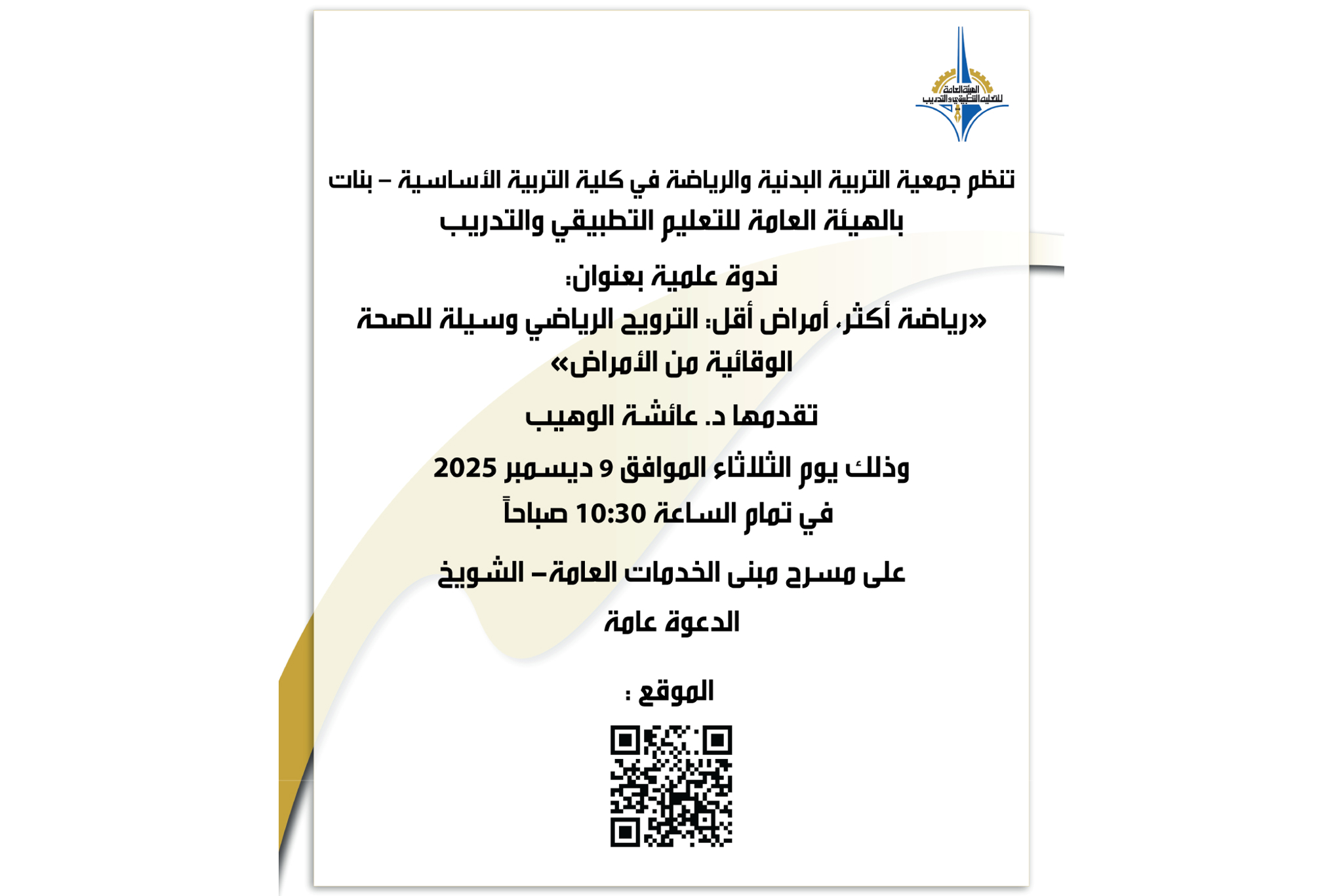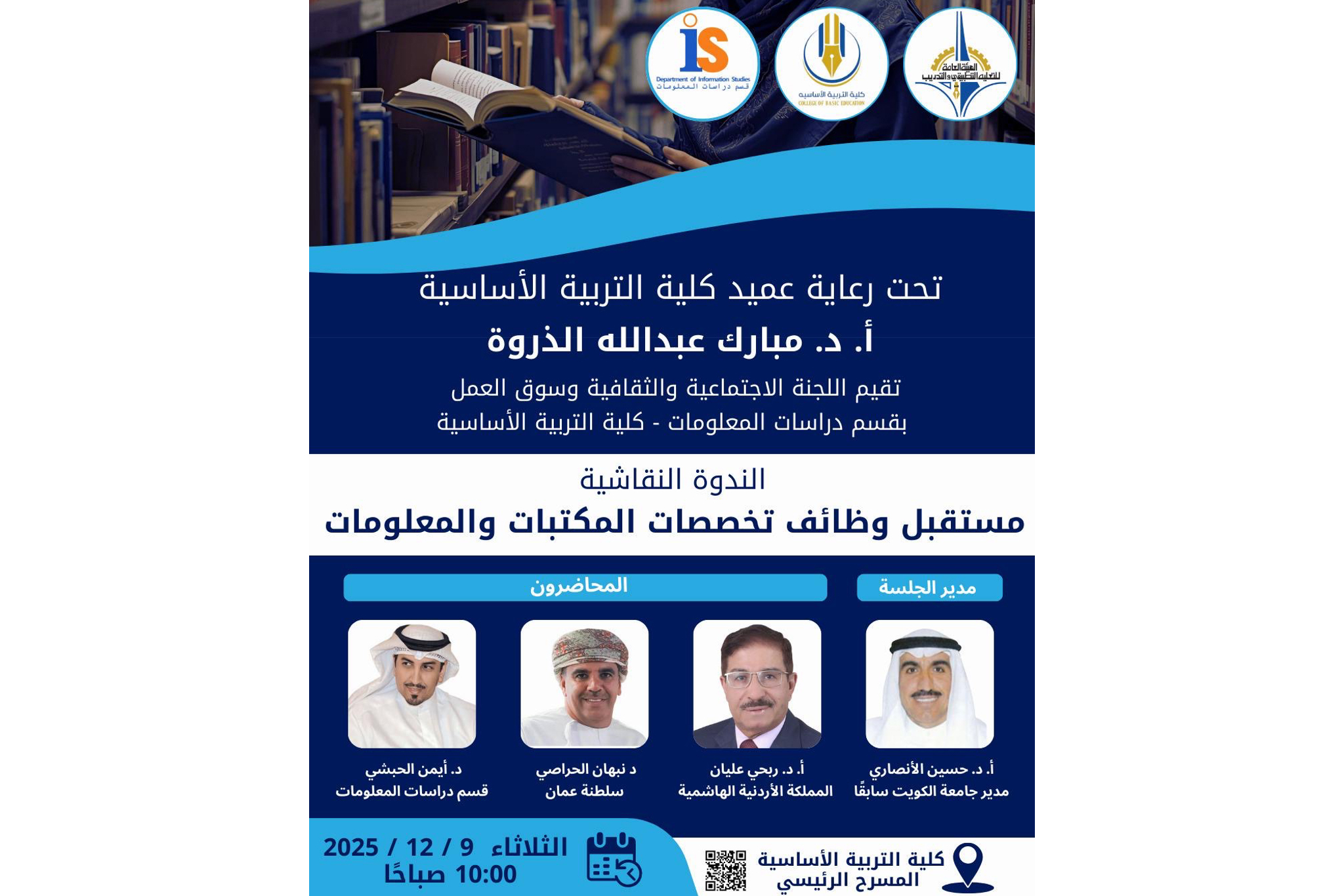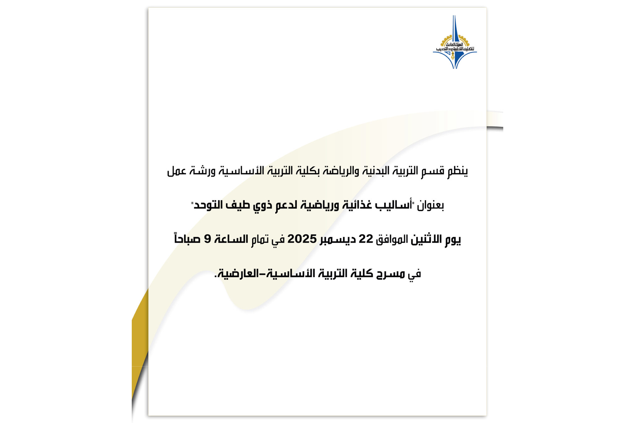 تحت رعاية عميد كلية التربية الأساسية الأستاذ الدكتور مبارك الذروة أقيمت ورشة عمل دولية بعنوان: أساليب غذائية ورياضية لدعم ذوي طيف التوحد ومرضى السكري، بالتعاون مع الأكاديمية العربية الالمانية لشباب العلماء في العلوم والإنسانيات، وتنظيم الأستاذ الدكتور محمد القطان – قسم التربية البدنية والرياضة، والأستاذ الدكتور سارة عبدالحميد - أستاذ الفارماكولوجي بجامعة كفر الشيخ – مصر، وذلك في يوم الاثنين الموافق 22-12-2025، على المسرح الرئيسي للكلية مبنى 5.