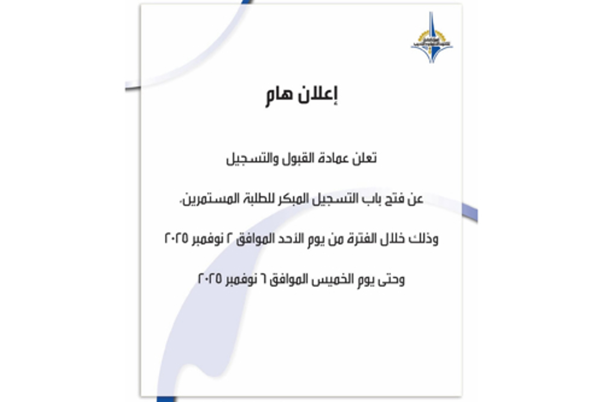 تعلن عمادة القبول والتسجيل عن فتح باب التسجيل المبكر للطلبة المستمرين