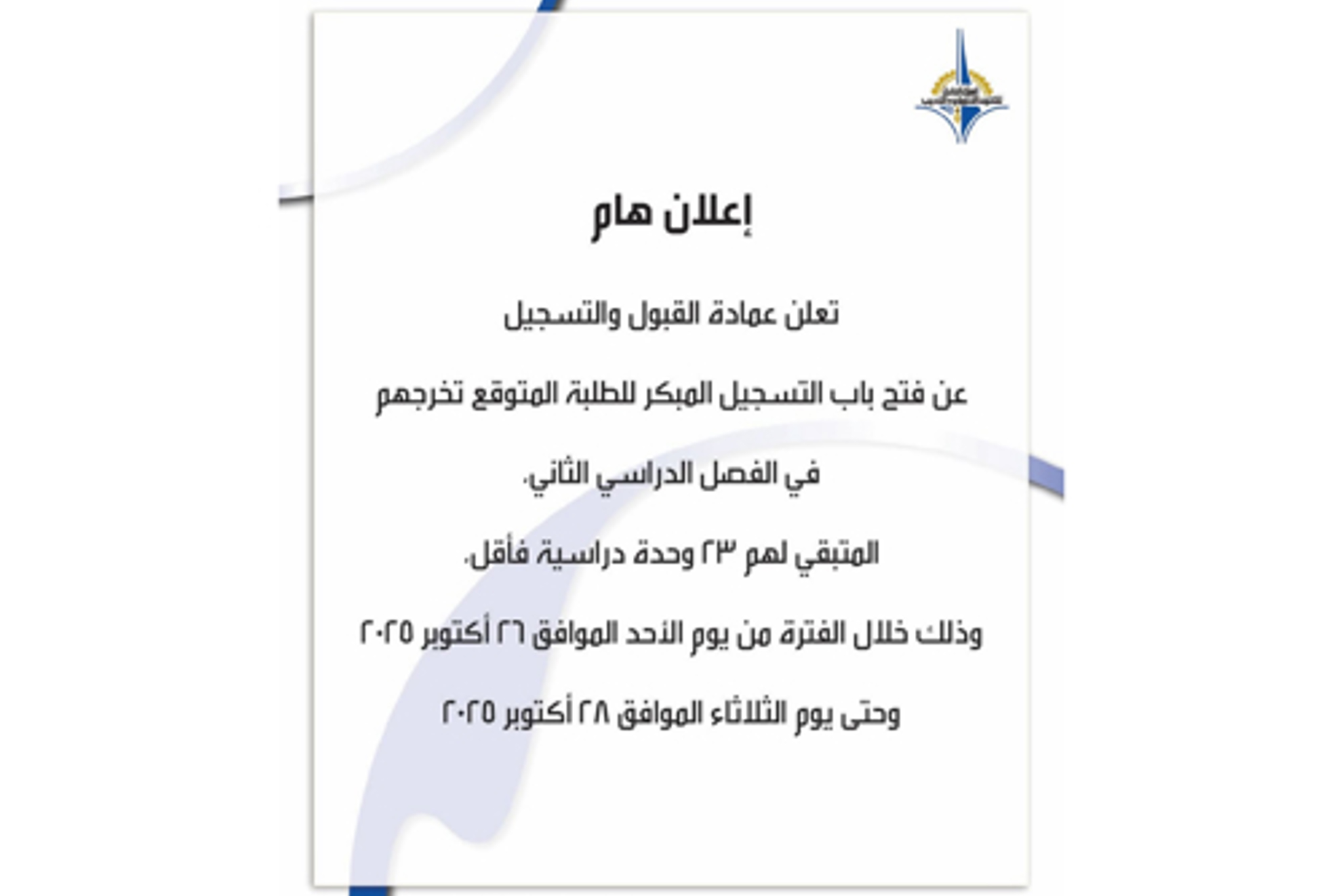تعلن عمادة القبول والتسجيل انه وفقا للوائح التسجيل في الهيئة