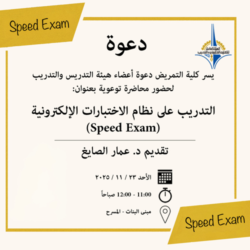 يسر كلية التمريض دعوة أعضاء هيئة التدريس و التدريب في مختلف القطاعات في الهيئة لحضور محاضرة بعنوان (التدريب على نظام الاختبارات الالكترونية speed exam)