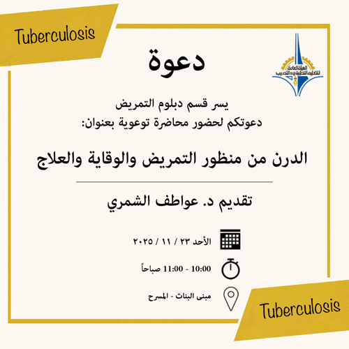 المزيديسر قسم دبلوم التمريض دعوتكم لحضور محاضرة توعوية بعنوان( الدرن من منظور التمريض و الوقاية والعلاج ) تقدمها الدكتورة عواطف الشمري في كلية التمريض مبنى البنات- المسرح.