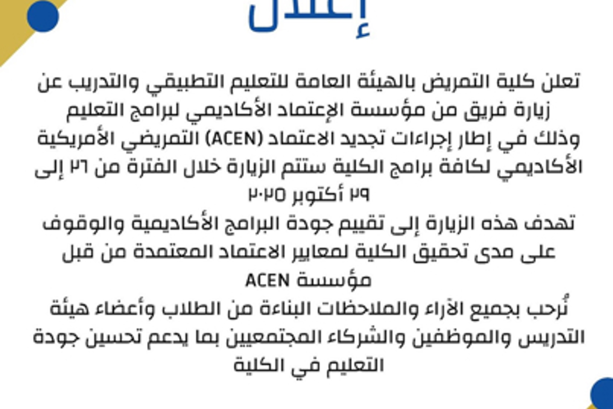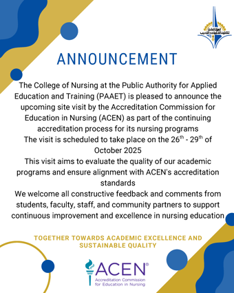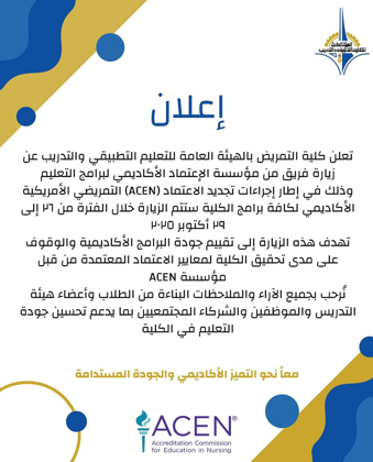 تعلن كلية التمريض عن زيارة فريق من مؤسسة الإعتماد الأكاديمي لبرامج التعليم وذلك في إطار إجراءات تجديد الاعتماد (ACEN) التمريضي الأمريكية الأكاديمي لكافة برامج الكلية..