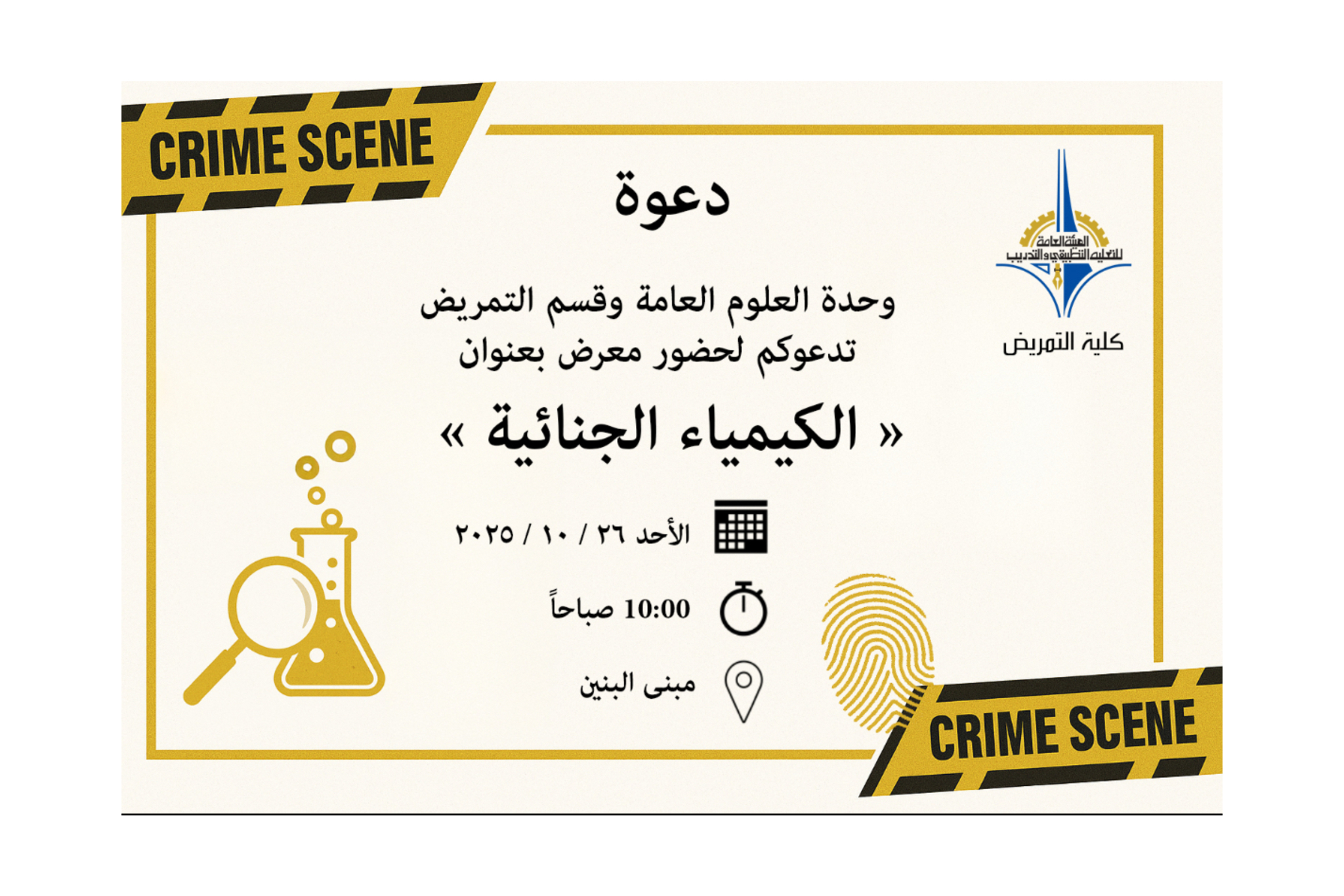 إعلان من كلية التمريض لحضور معرض "الكيمياء الجنائية"