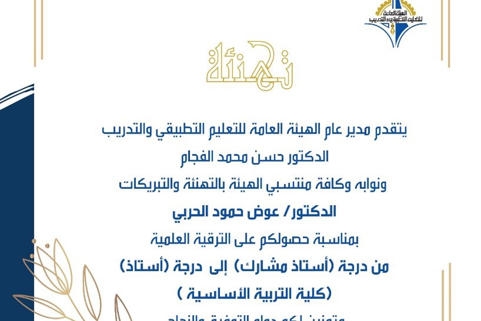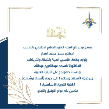 والهيئة العامة للتعليم التطبيقي والتدريب بجميع منتسبيها ترفع أسمى آيات الشكر والامتنان والعرفان لما لمسوه من سموكم من اهتمام وتقدير للعلم والتعليم والطالب، وتقدير سموكم للمؤسسات التعليمية والتي كانت دوماً محل اهتمامكم وحرصكم ومؤازرتكم ودعمكم، فلسموكم منا جميعاً الحب والتقدير والامتنان.