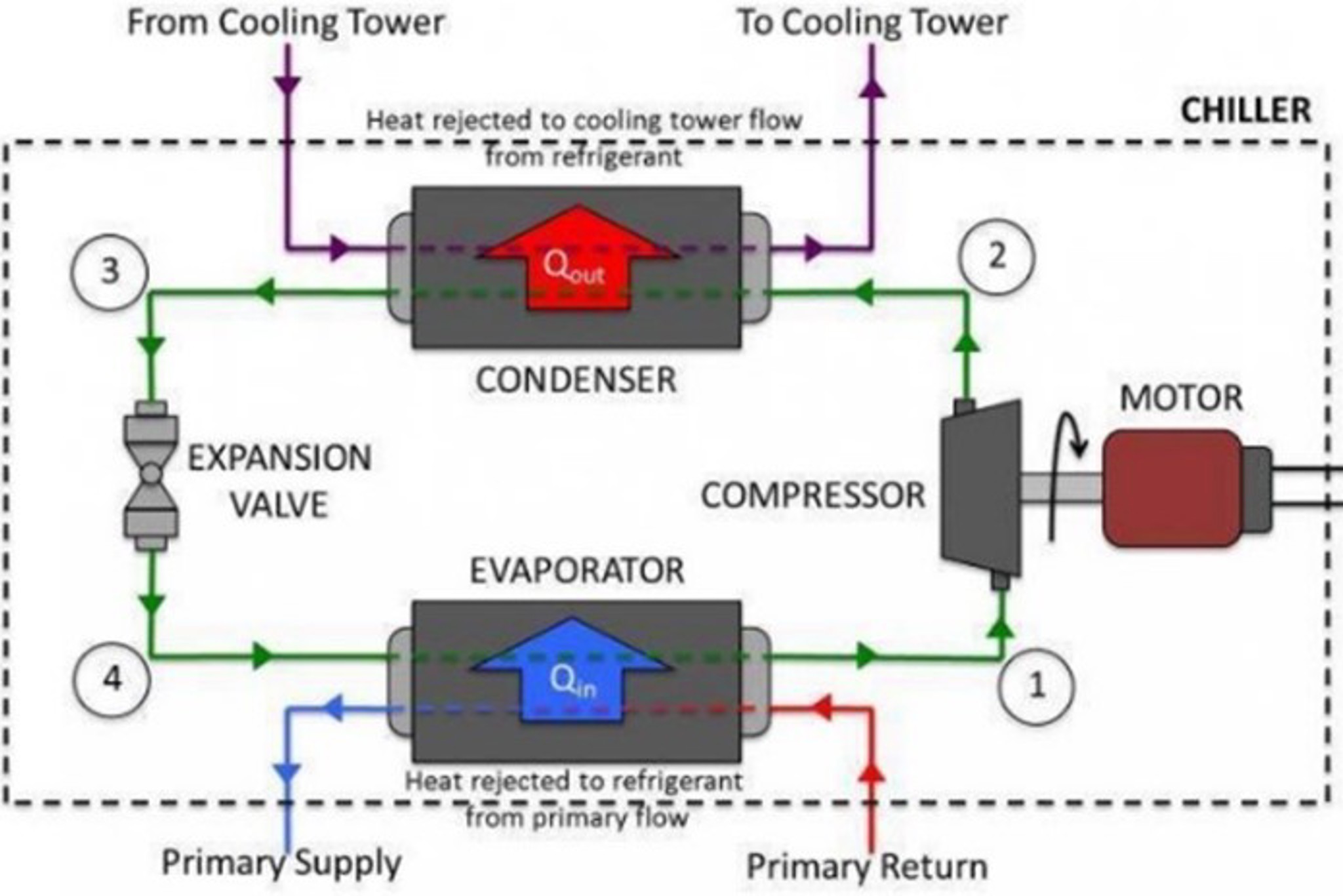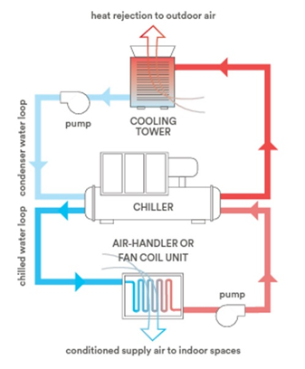 يتم استخدام الماء كوسيط للتبريد فى التكيف المركزى داخل الأماكن المراد تبريدها فيتم تبريد الماء أولا أثناء مروره في المبخر