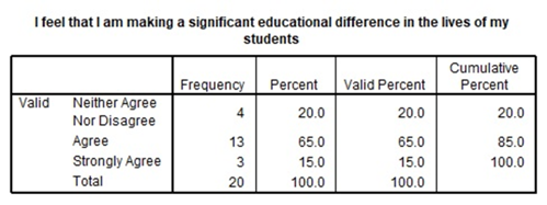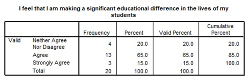 - Most of the teachers agreed that they are satisfied with their job. On the other hand, only 20% of them disagreed on making a significant educational difference in the lives of their students, as indicated in Table 2 below.