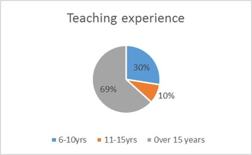 - 30% of those teachers were having experience in the teaching process between 6 to 10 years, whereas 10% of them were having experience between 11 to 15 years. Moreover, 60% of them were having experience over 15 years in the teaching process, as illustrated in Figure 1 below.