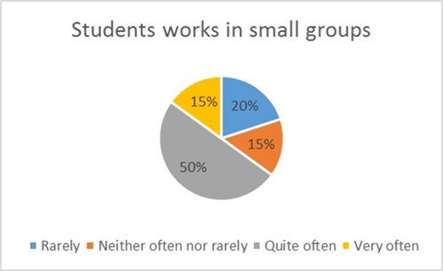 - Teachers' responses were slightly different concerning students work in small groups. 35% of them stated that they rarely involve students to work in small groups. On the other hand, 65% of those teachers assured that they often involve students to work in small groups, as illustrated in Figure 2 below.