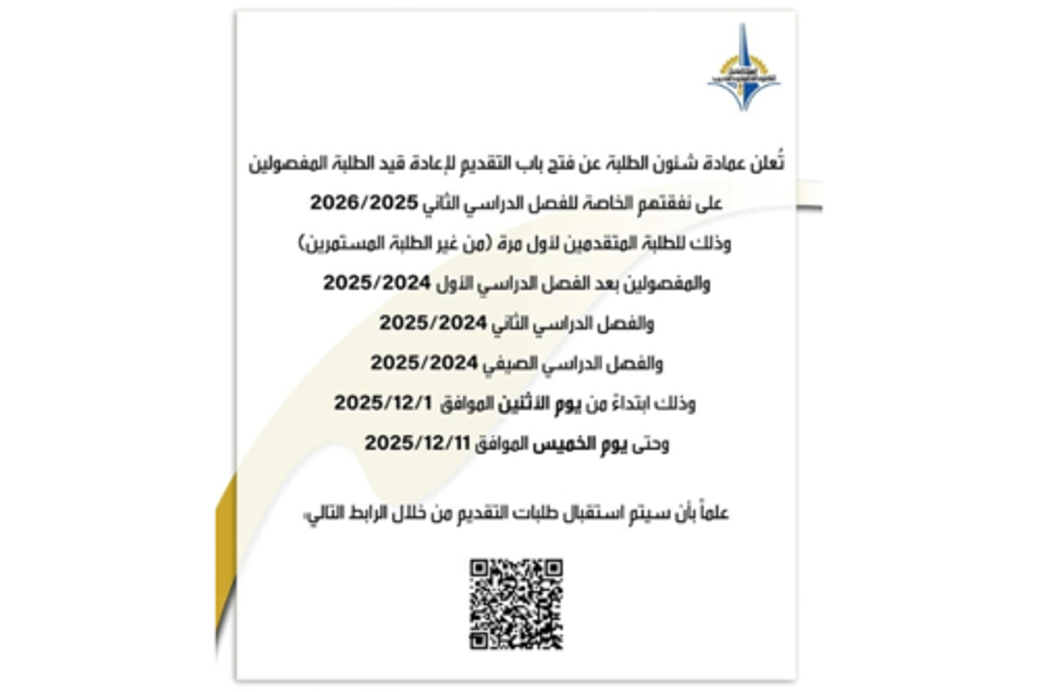 المزيدتعلن عمادة القبول والتسجيل عن خطة قبول الشواغر في الكليات والمعاهد والدورات التدريبية للعام 2026/2025