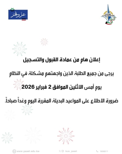 المزيداعلان عمادة شئون الطلبة عن ضرورة مراجعة قسم الاعلانات و المكافأت لطلبة الكليات الذين لم تصرف لهم مكافأة التخصص النادر