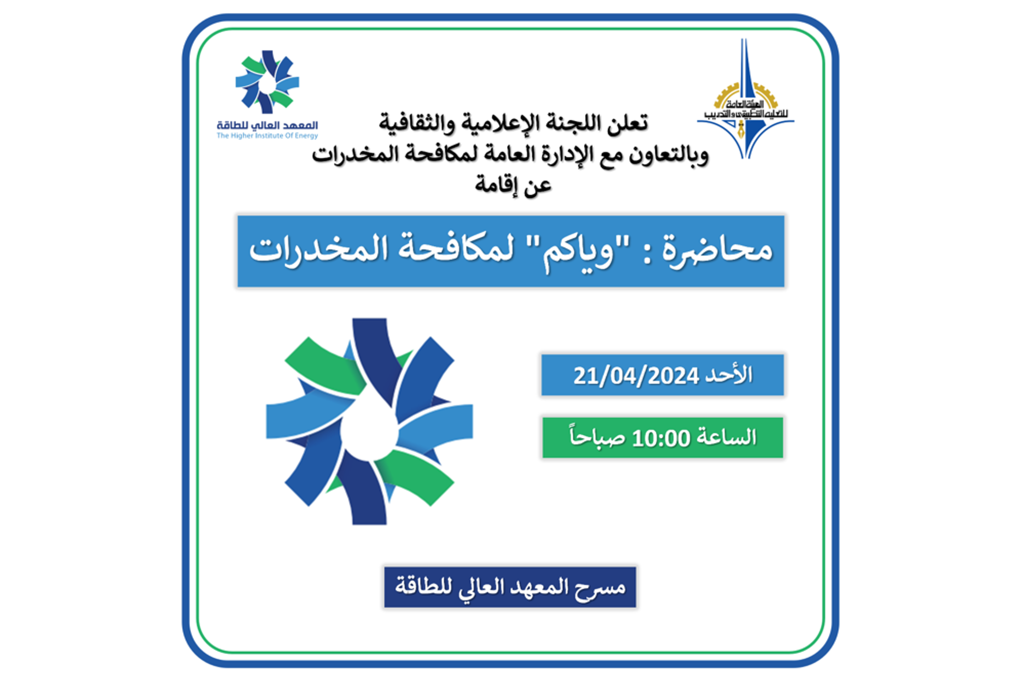 أقام المعهد العالي للطاقة محاضرة "وياكم" لمكافحة المخدرات بالتعاون مع الإدارة العامة لمكافحة المخدرات.
