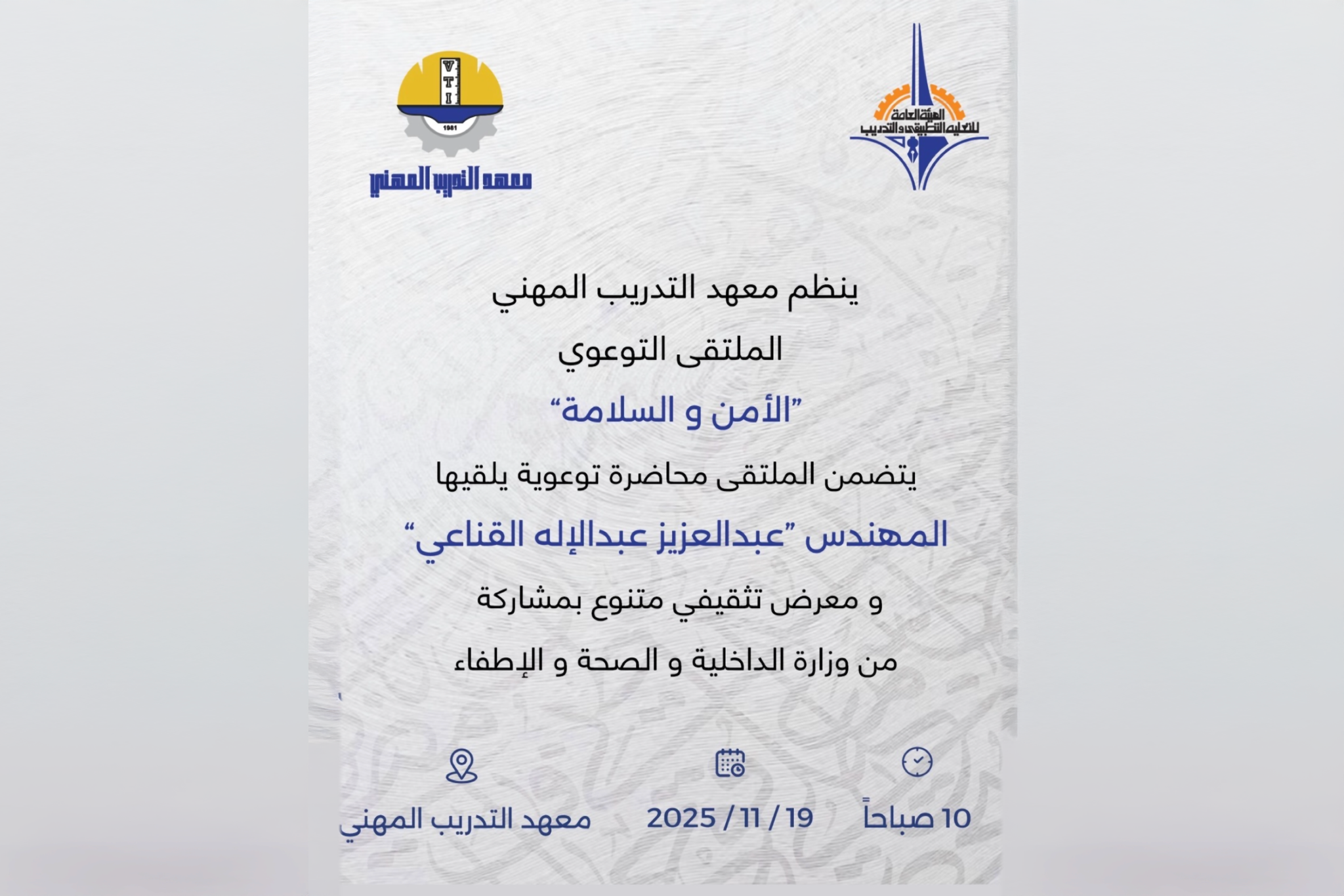 يسر معهد التدريب المهني بالتعاون مع عمادة شئون الطلبة دعوتكم لحضور حفل العيد الوطني ويوم التحرير "عشانك يا وطن" الذي يقام برعاية وحضور مدير عام الهيئة العامة للتعليم التطبيقي والتدريب د.حسن محمد الفجام
